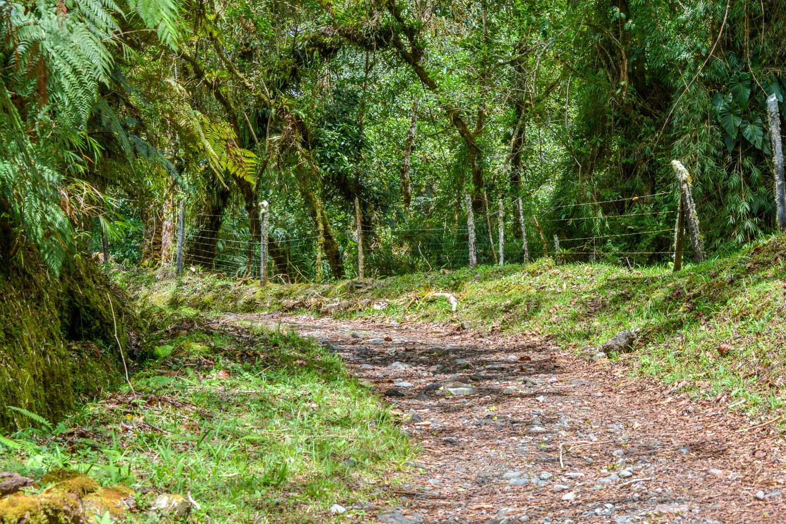 The trail started at a ranger station for sign in (free hike) and then followed a gravel road over rolling hills surrounded by some farmland at the edge of the rain forest. It started raining shortly after we reached the trail head and only stopped for short periods during our 4 hour hike. Guess that is just what you get when hiking through a rain forest. It wasn't bad though because it was already a bit chilly at that elevation so we wanted to wear our rain jackets anyway.