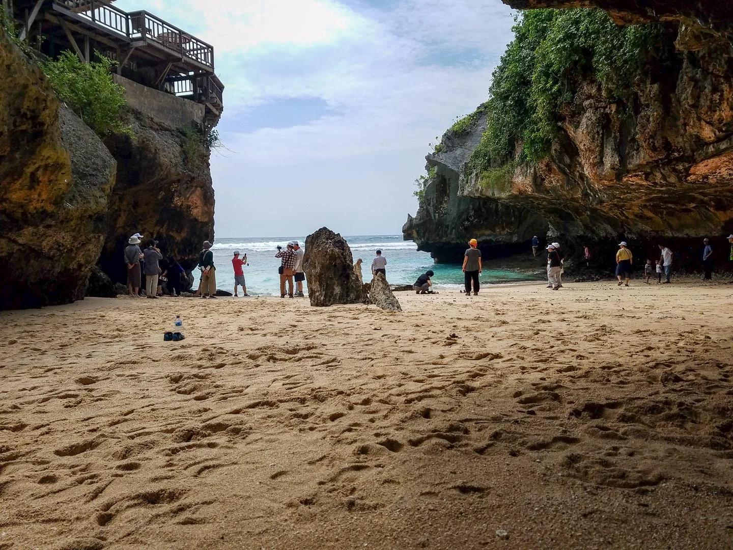 Our first beach was Uluwatu—a small beach with vicious waves hugged by coves. It’s a gorgeous beach and wonderful for dipping your toes into but unless you’re an expert surfer we wouldn’t suggest swimming or surfing. The rip current is strong. There are people selling beer and cold drinks, so at best take in the view (including people watching the bus loads of Chinese tourists that wander down and take pictures) and bring a picnic. I helped a local woman selling scarves collect puka shells. The beach had tons of them! The way down to the beach reminded me ever so slightly of Santorini. We descended down a maze of stairs and shops/restaurants that seemed to be carved on the side of the cliff. I would definitely recommend checking out the beach, even if it is full of Insta-posers. While scooter-ing to the second beach, a large tour bus got in front of us. Bryan found an opening in traffic first to speed around it. While I was searching for my opening to get around the bus, a local rode his scooter beside mine and attempted to make conversation. “What’s your name?” “Where are you from?” “How do you like Bali?” At this point, I was just politely answering, but luckily right after his “You’re cute” comment happened I found my opening and whizzed away. Sorry dude, this lady is happily married! Byeeeeee!